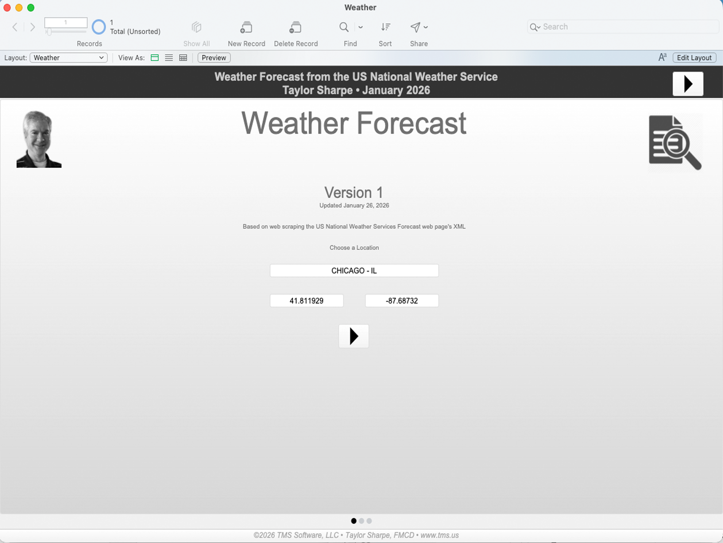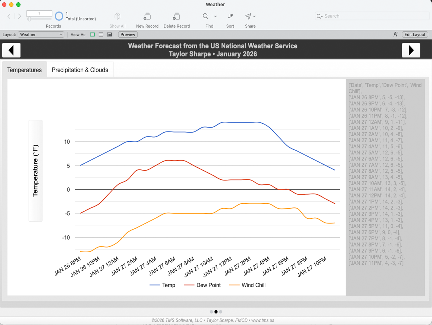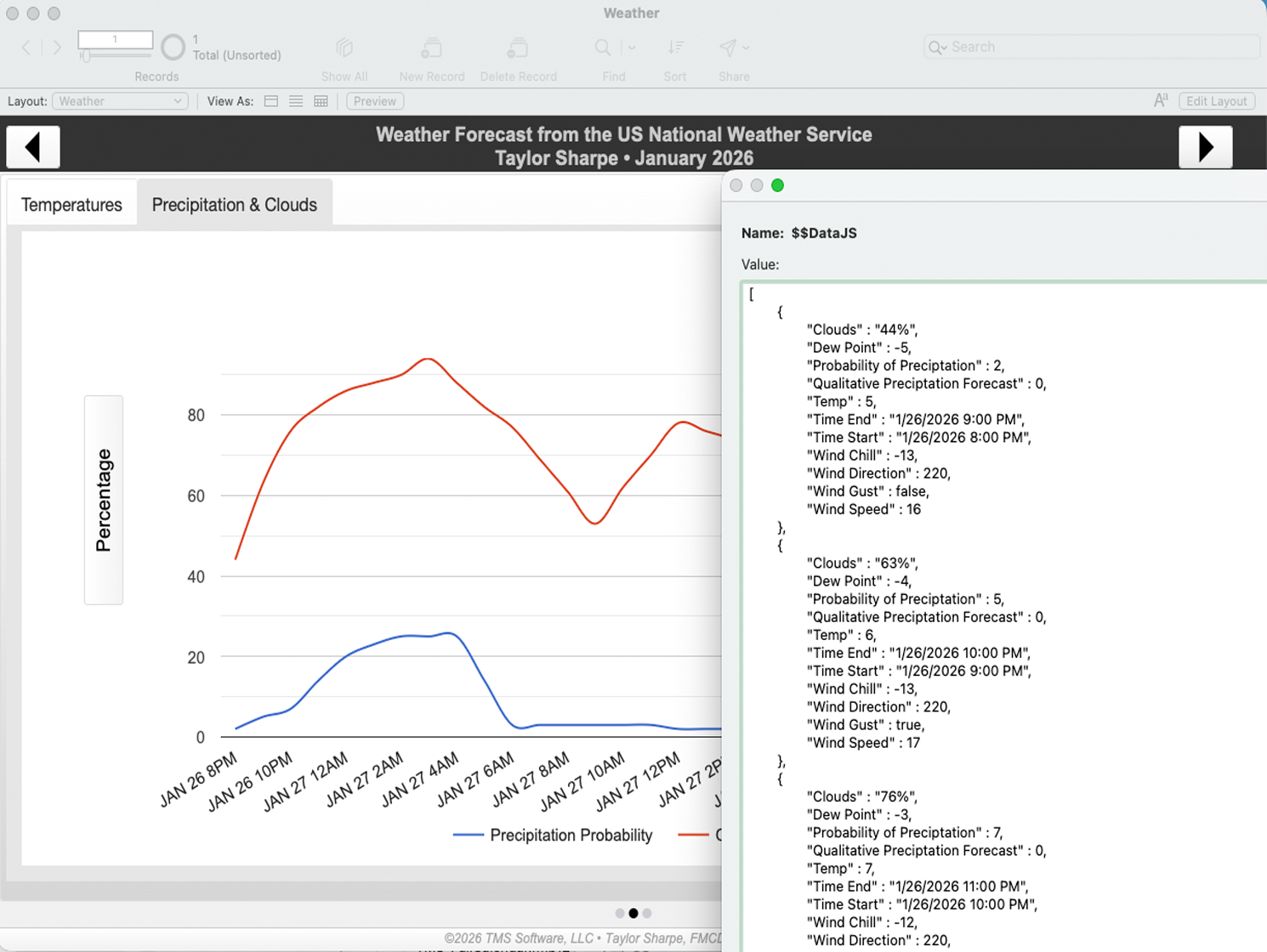 Product websiteThe US Weather Service publishes XML with the weather forecast for the next several days updated every hour based on geolocation in the USA. This solution pulls that information and converts it to JSON for more easily FileMaker manipulation and charts it with a Google Chart. This is a template designed for you to copy and use as needed in one of your solutions.