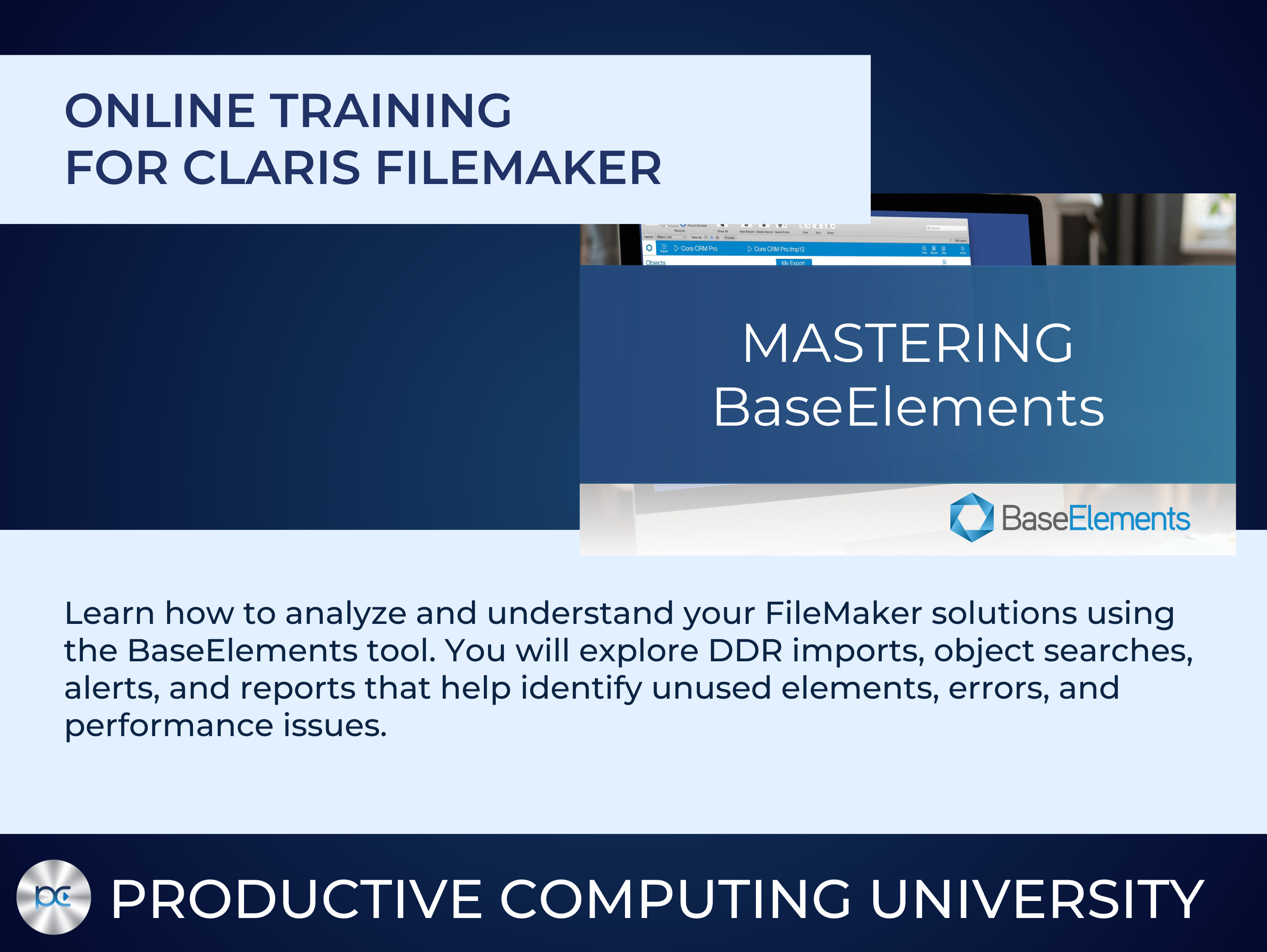 Product websiteBaseElements Mastery from Productive Computing University teaches you how to use the BaseElements analysis tool (from Goya) to better understand, maintain, and improve your FileMaker solutions. BaseElements works alongside the FileMaker Database Design Report (DDR) to provide a detailed view of every element inside your FileMaker file.