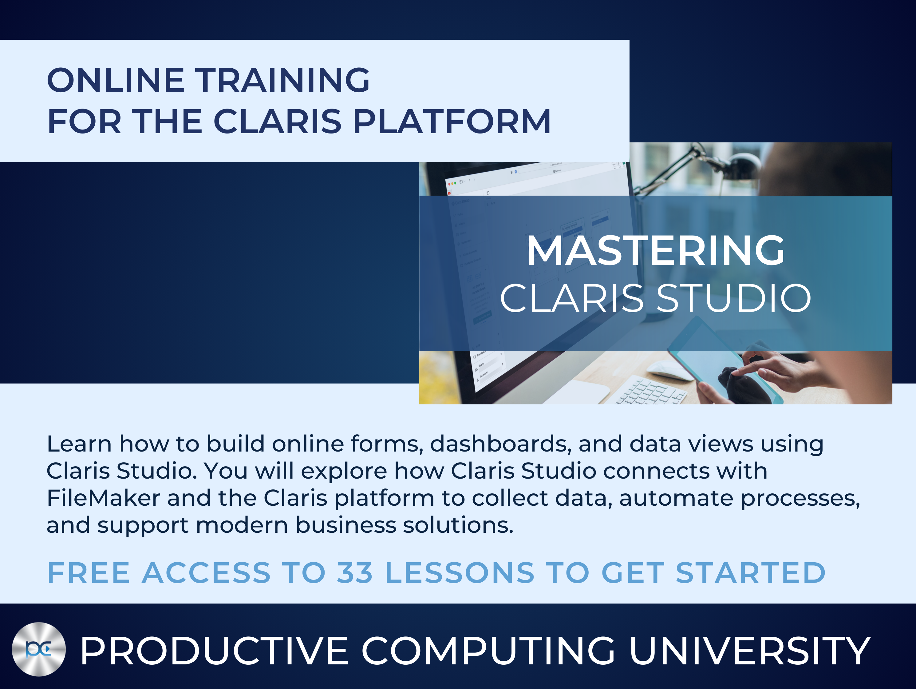 Product websiteMastering Claris Studio from Productive Computing University teaches you how to use Claris Studio to build modern, web based solutions that connect with the Claris platform. In this course, you will learn how Claris Studio works alongside FileMaker Pro, FileMaker Server, FileMaker Go, and Claris Connect to help you collect data and streamline business processes.