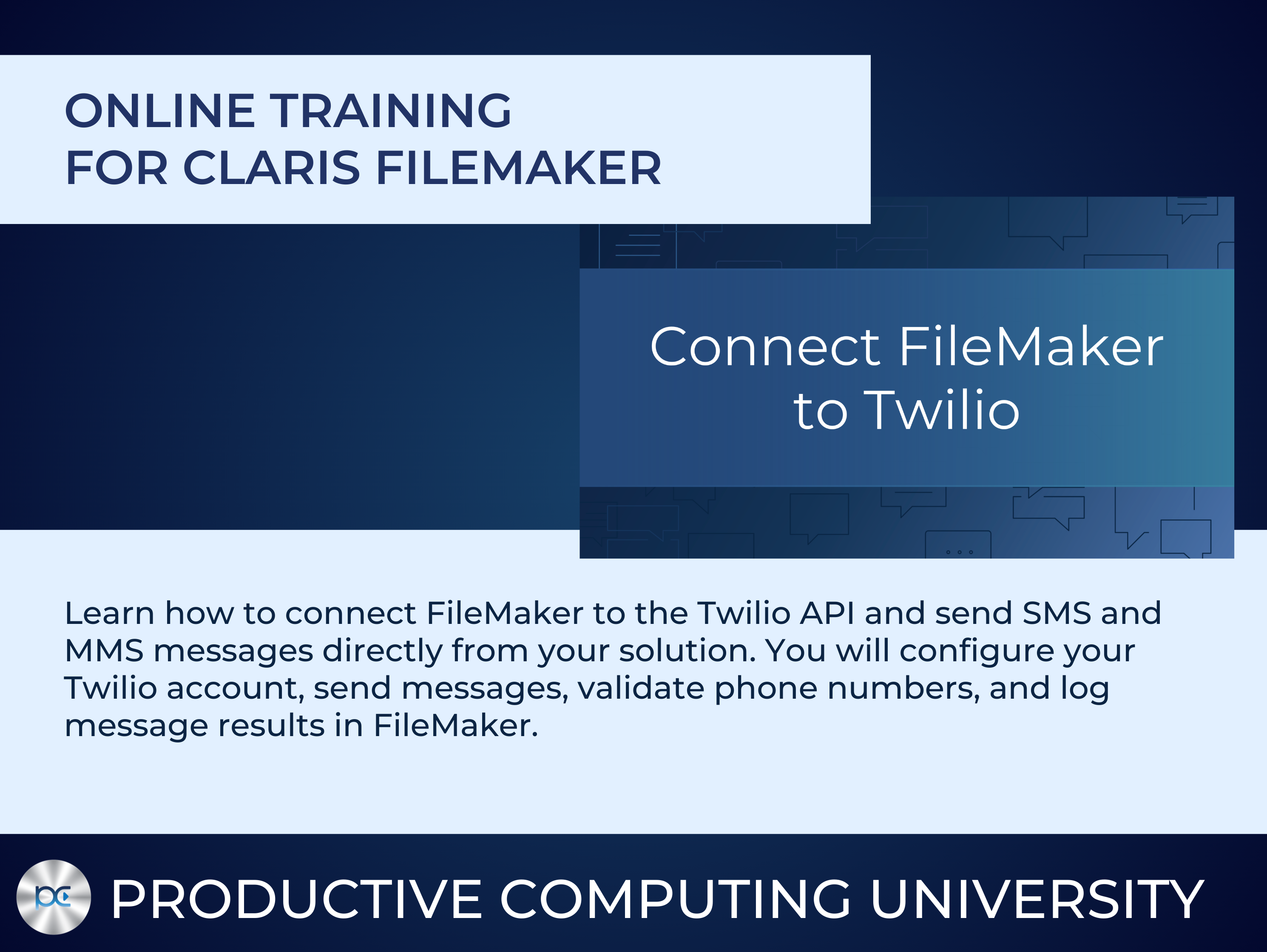 Product websiteConnect FileMaker to Twilio from Productive Computing University teaches you how to integrate FileMaker with the Twilio API so you can send text messages directly from your FileMaker solution. Text messaging is one of the most effective ways to communicate with customers, making it ideal for notifications, reminders, and important updates.