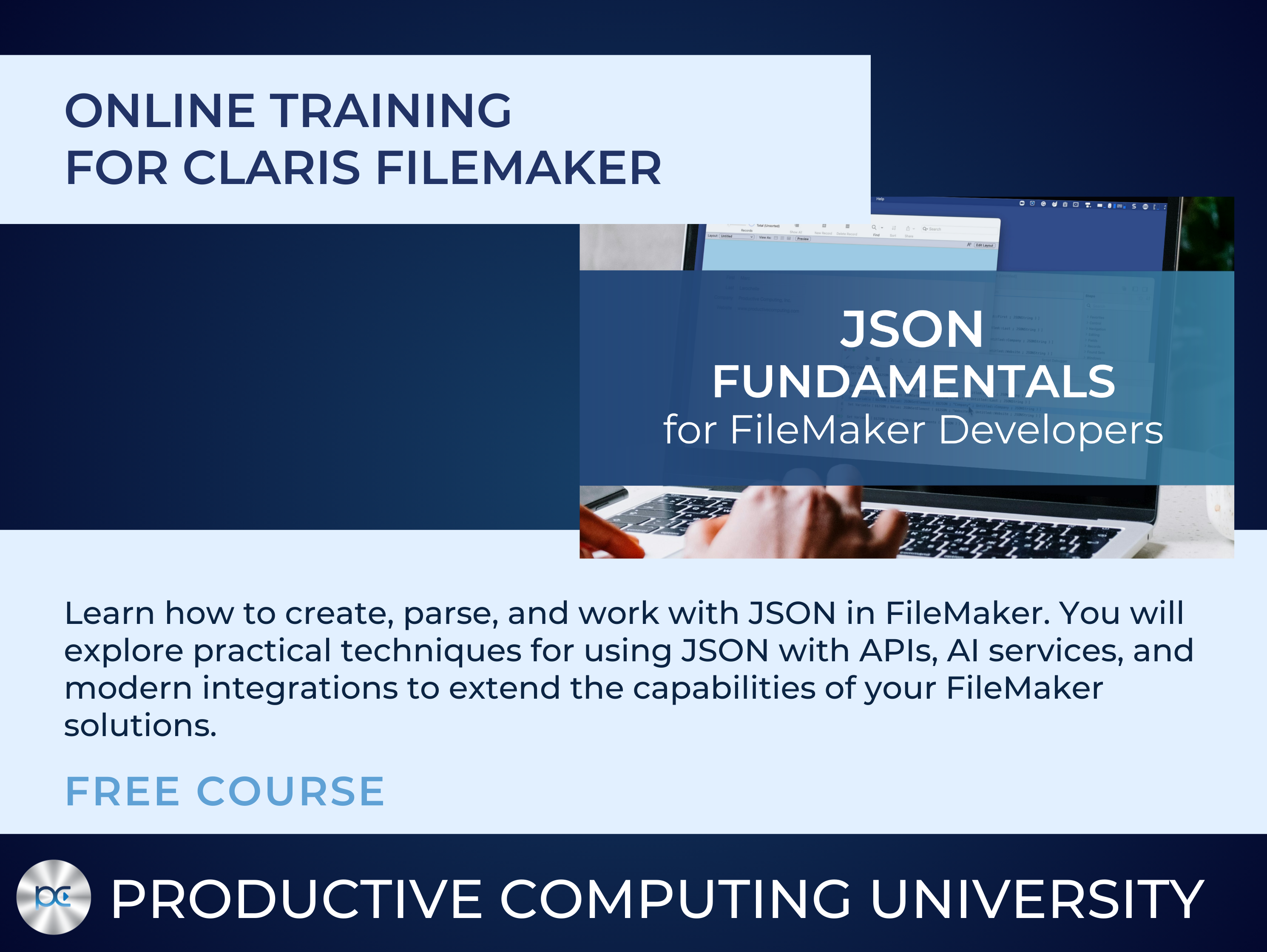 Product websiteJSON Fundamentals for FileMaker Developers from Productive Computing University teaches you how to work with JSON inside your FileMaker solutions. JSON has become a standard format for exchanging data between systems, making it essential for developers working with APIs, artificial intelligence services, JavaScript integrations, and modern web technologies.