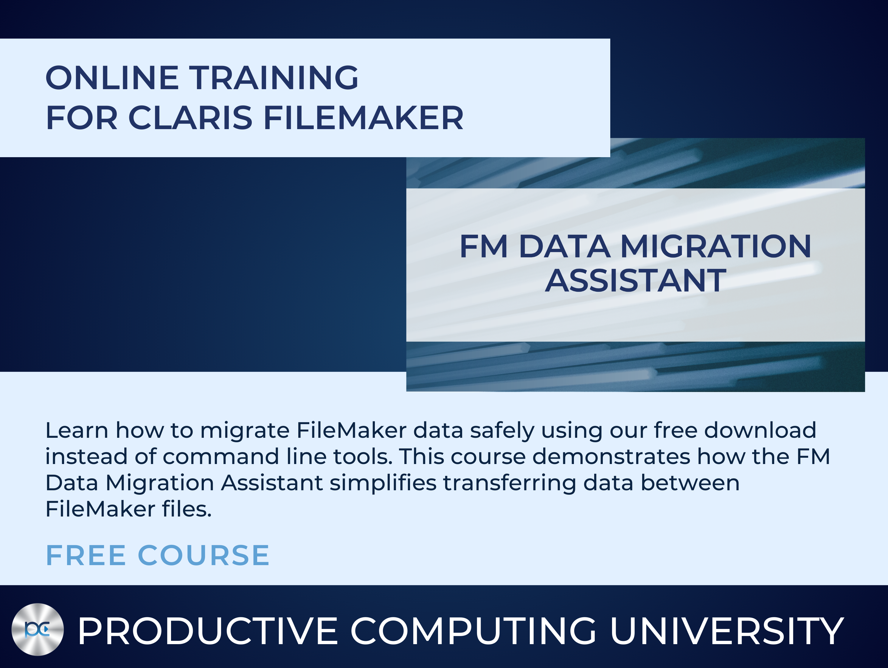 This course explains how the FM Data Migration Assistant works alongside FileMaker’s built in migration utility to provide a clear, user friendly interface for performing migrations. Instead of working in command line environments such as Terminal or Command Prompt, you can manage the migration process using a familiar FileMaker interface.